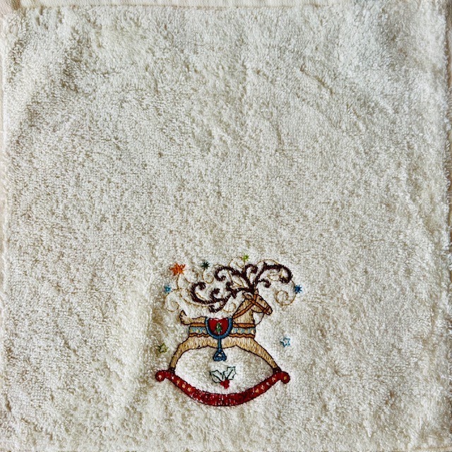 サイズ:30 x 30 cm 素材:綿100% 布の色:ベージュ 織り方:テリー織(タオル地) 商品:フェイスウォッシュクロス 柄:木馬 ヨーロッパではクリスマス期間公園に遊園地ができます。キラキラした木馬は人気ですね。 メーカー:サスピロ・ド・アルガダオ 2012年5月創業、オリジナルの機械刺繍を施した高品質な布製品を提供しているポルトガルの会社です。 綿や麻などの天然繊維を使用し、すべてポルトガルで製造されています。 運営人は、愛らしく優しい柄の刺繍が大好きです。現地のお店でどの柄にするか選ぶのに苦労しました。 PorToccaはこの会社の輸入販売元です。