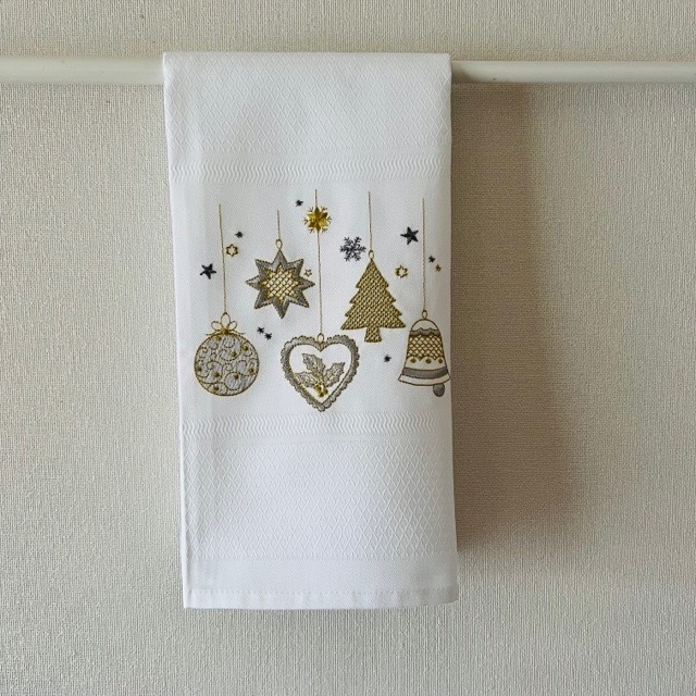 サイズ:50 x 70 cm 素材:綿100% 織り方:ジャガード織で小さなダイヤモンド柄 商品:キッチンタオル(布巾) ポルトガルでは購入した刺繍入りキッチンタオル(布巾)の端に手作業でフリルなどを編み、自分で使ったり、プレゼントしたりするようです。運営人のポルトガル在住友人もお義母さまからクリスマスや誕生日にプレゼントで貰うようです。素敵な風習ですね。 運営人は家族にポルトガルのキッチンタオル(布巾)をお土産と渡しました。家族は刺繍が素敵でキッチンタオル(布巾)にして使うのはもったいないと、ソファーの頭があたる部分にかけて飾っています。 運営人はキッチンで使ってますが、布巾としては少し大きく感じるので、食器を拭く布巾ではなく、手を拭くタオルに使ってます。 長くポルトガルに住んでいる友人にとっては食器を拭く布巾にしか見えないようですが。 柄:金色のオーナメント クリスマス飾りの金色のオーナメントが刺繍されていて華やぎます メーカー:サスピロ・ド・アルガダオ 2012年5月創業、オリジナルの機械刺繍を施した高品質な布製品を提供しているポルトガルの会社です。 綿や麻などの天然繊維を使用し、すべてポルトガルで製造されています。 運営人は、愛らしく優しい柄の刺繍が大好きです。現地のお店でどの柄にするか選ぶのに苦労しました。 ポルトッカはこの会社の輸入販売元です。