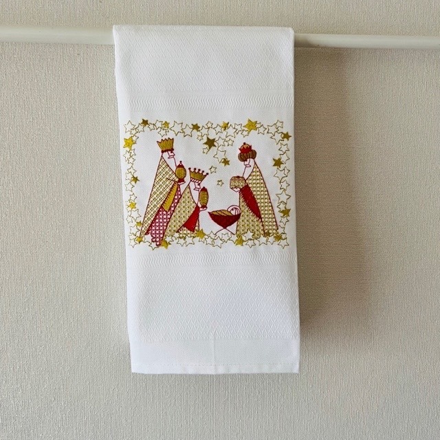 サイズ:50 x 70 cm 素材:綿100% 織り方:ジャガード織で小さなダイヤモンド柄 商品:キッチンタオル(布巾) ポルトガルでは購入した刺繍入りキッチンタオル(布巾)の端に手作業でフリルなどを編み、自分で使ったり、プレゼントしたりするようです。運営人のポルトガル在住友人もお義母さまからクリスマスや誕生日にプレゼントで貰うようです。素敵な風習ですね。 運営人は家族にポルトガルのキッチンタオル(布巾)をお土産と渡しました。家族は刺繍が素敵でキッチンタオル(布巾)にして使うのはもったいないと、ソファーの頭があたる部分にかけて飾っています。 運営人はキッチンで使ってますが、布巾としては少し大きく感じるので、食器を拭く布巾ではなく、手を拭くタオルに使ってます。 長くポルトガルに住んでいる友人にとっては食器を拭く布巾にしか見えないようですが。 柄:星と東方の三博士 カトリック教徒に多いポルトガルらしく、東方の三博士が聖書に登場する有名なシーンが刺繍されてます。日本ではあまり見かけない柄ですね。 “東方の三博士”は、新約聖書の”マタイによる福音書”に登場する人物たちです。 イエス・キリストがユダヤのベツレヘムに生まれた頃、博士たちが、星に導かれて東の方からエルサレムにやって来たと書かれてます。 メーカー:サスピロ・ド・アルガダオ 2012年5月創業、オリジナルの機械刺繍を施した高品質な布製品を提供しているポルトガルの会社です。 綿や麻などの天然繊維を使用し、すべてポルトガルで製造されています。 運営人は、愛らしく優しい柄の刺繍が大好きです。現地のお店でどの柄にするか選ぶのに苦労しました。 ポルトッカはこの会社の輸入販売元です。