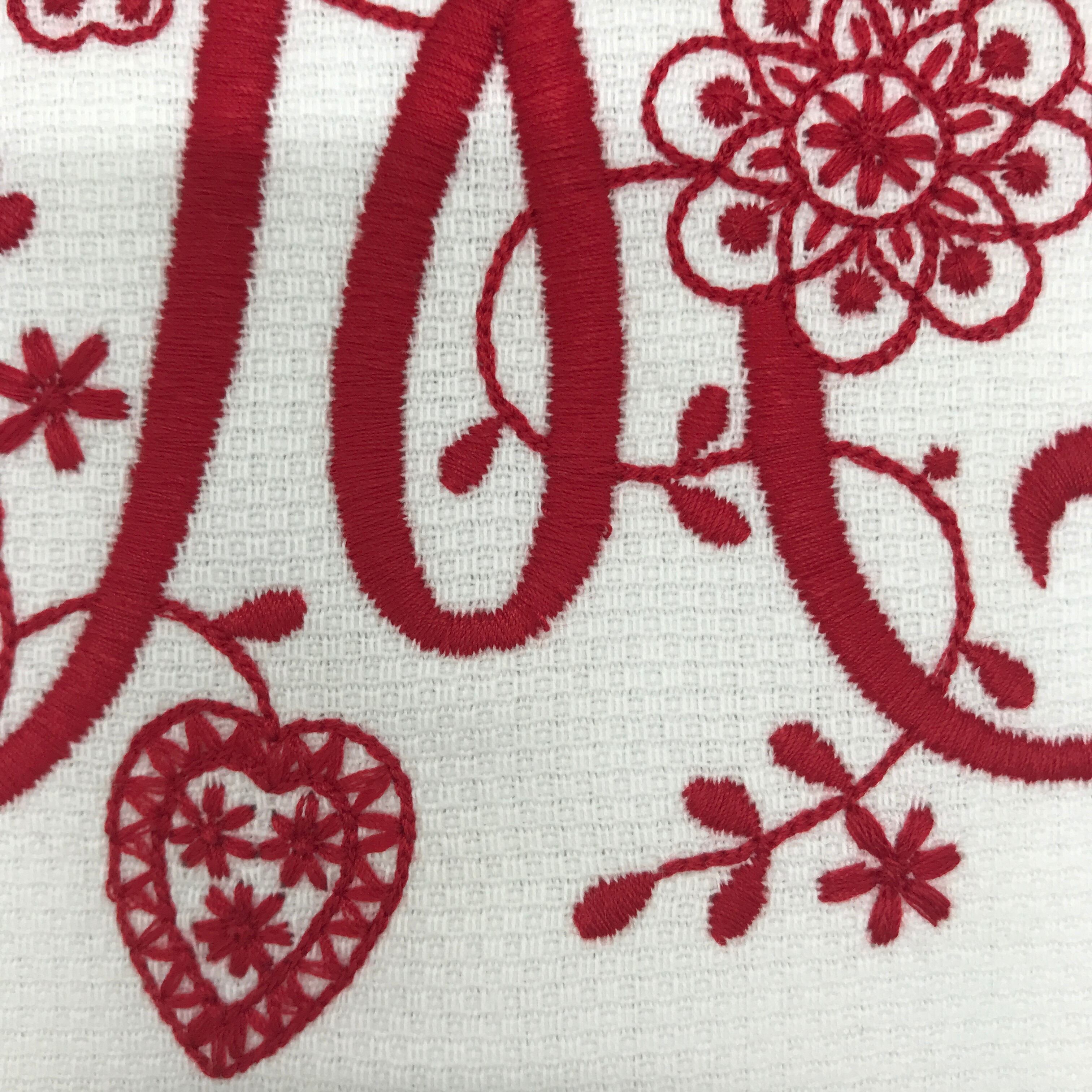 ポルトガル伝統のギマランイス刺繍の赤系、モチーフは自然やハート、伝統を現代風にアレンジしています