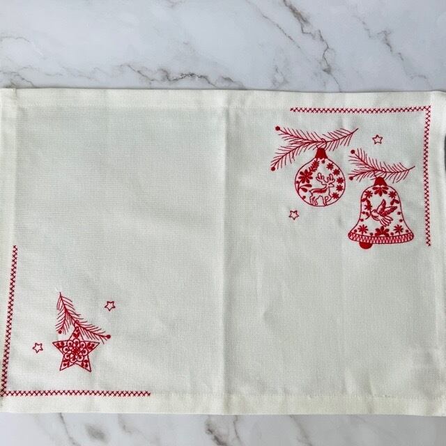 ギマラインス刺繍の特徴である赤い刺繍でクリスマスをお祝い