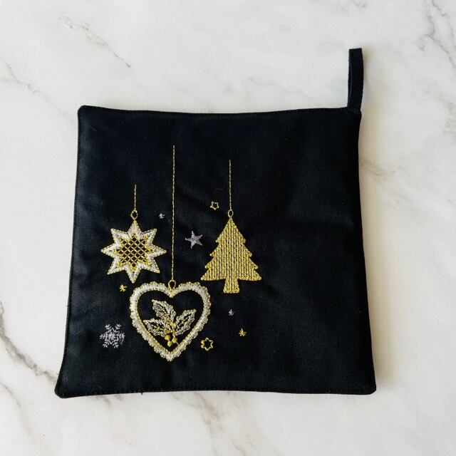 クリスマス飾りの金色のオーナメントが刺繍されていて華やぎます